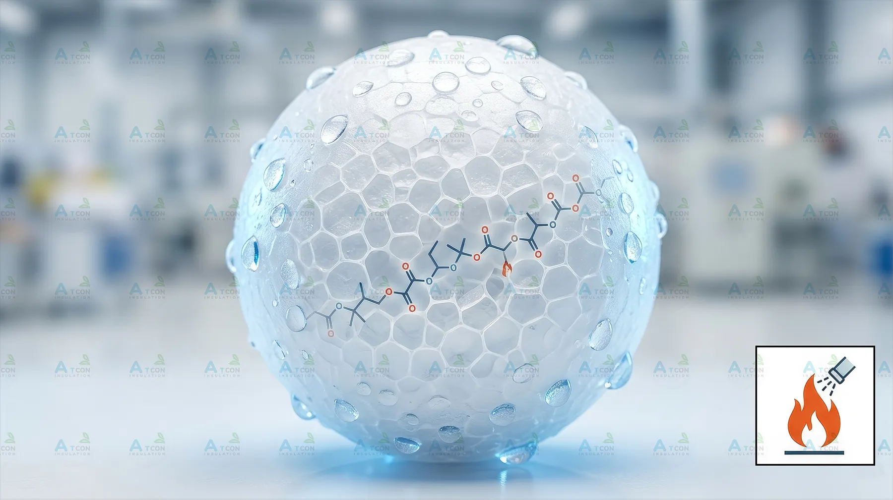 ภาพจำลองระดับโมเลกุลของเม็ดโฟม EPS จาก A.T. Foam แสดงโครงสร้างเซลล์โฟมสีขาว และโมเลกุลสารหน่วงไฟสีฟ้าที่ผสานอยู่ภายในอย่างสม่ำเสมอ เป็นหัวใจสำคัญที่ทำให้โฟมดับเองได้เมื่อนำแหล่งกำเนิดไฟออก
